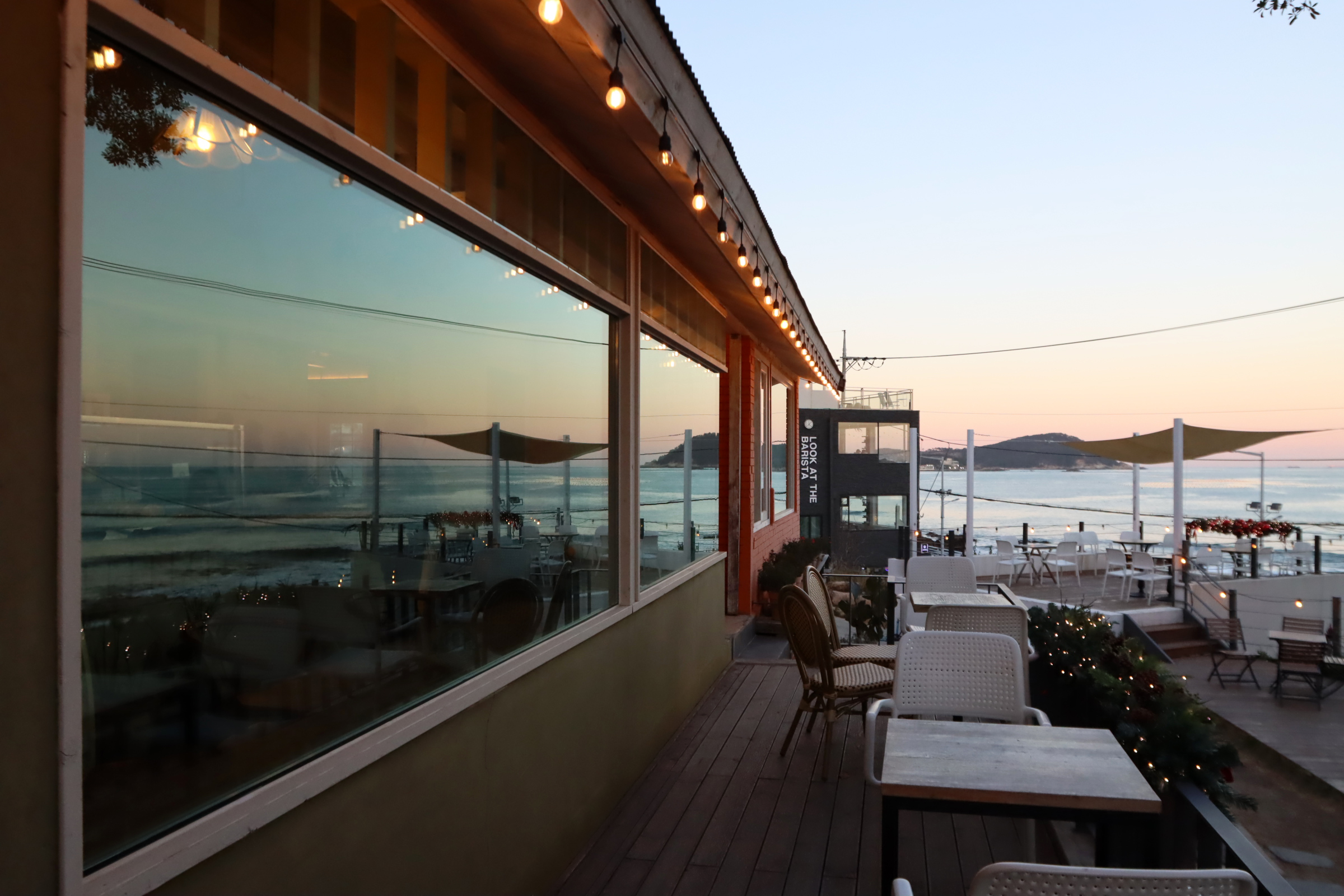 곧 해가 질 찰나라 해변열차도 보이고, 바다도 보이는 실내 자리를 택했다.