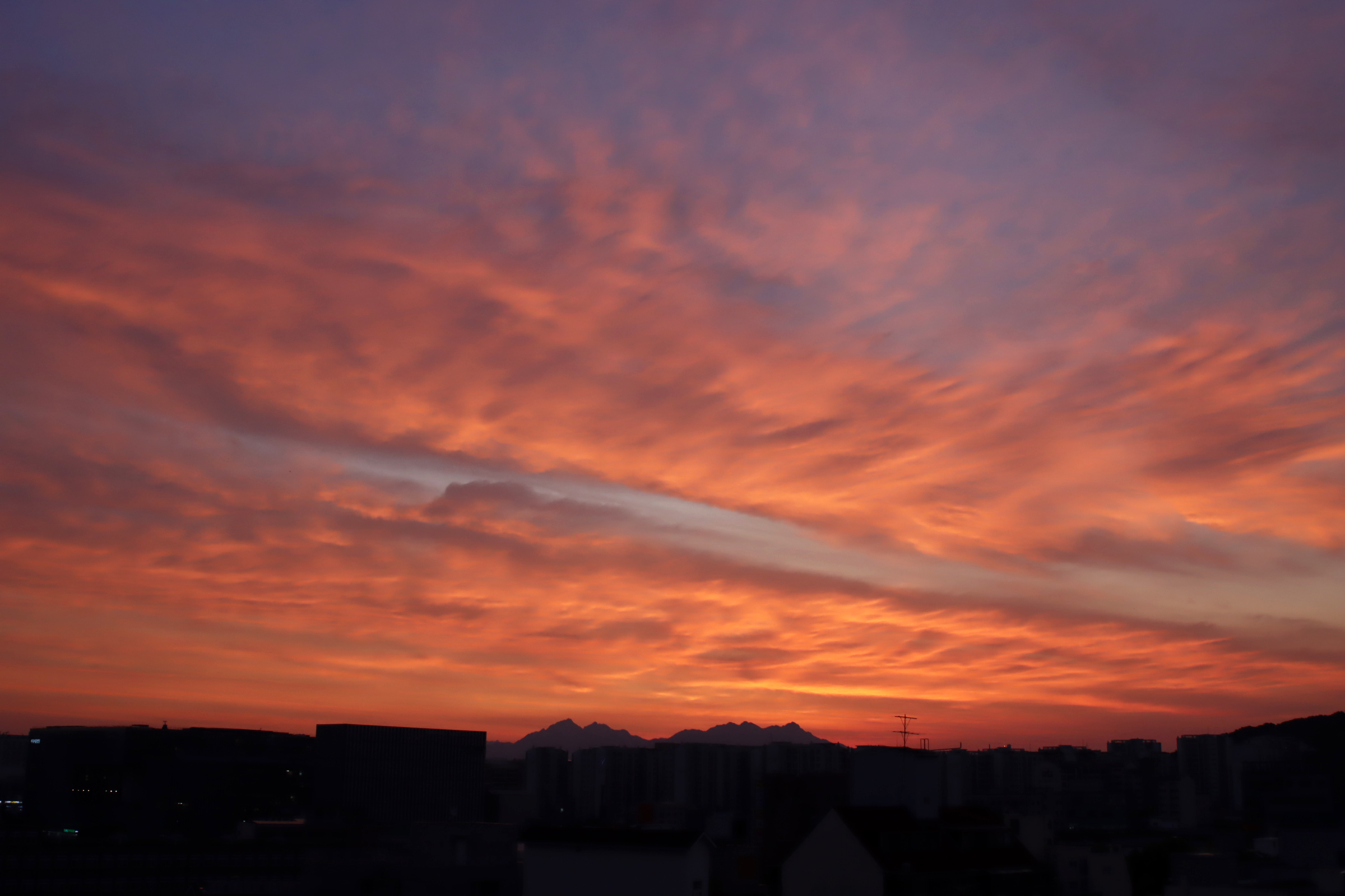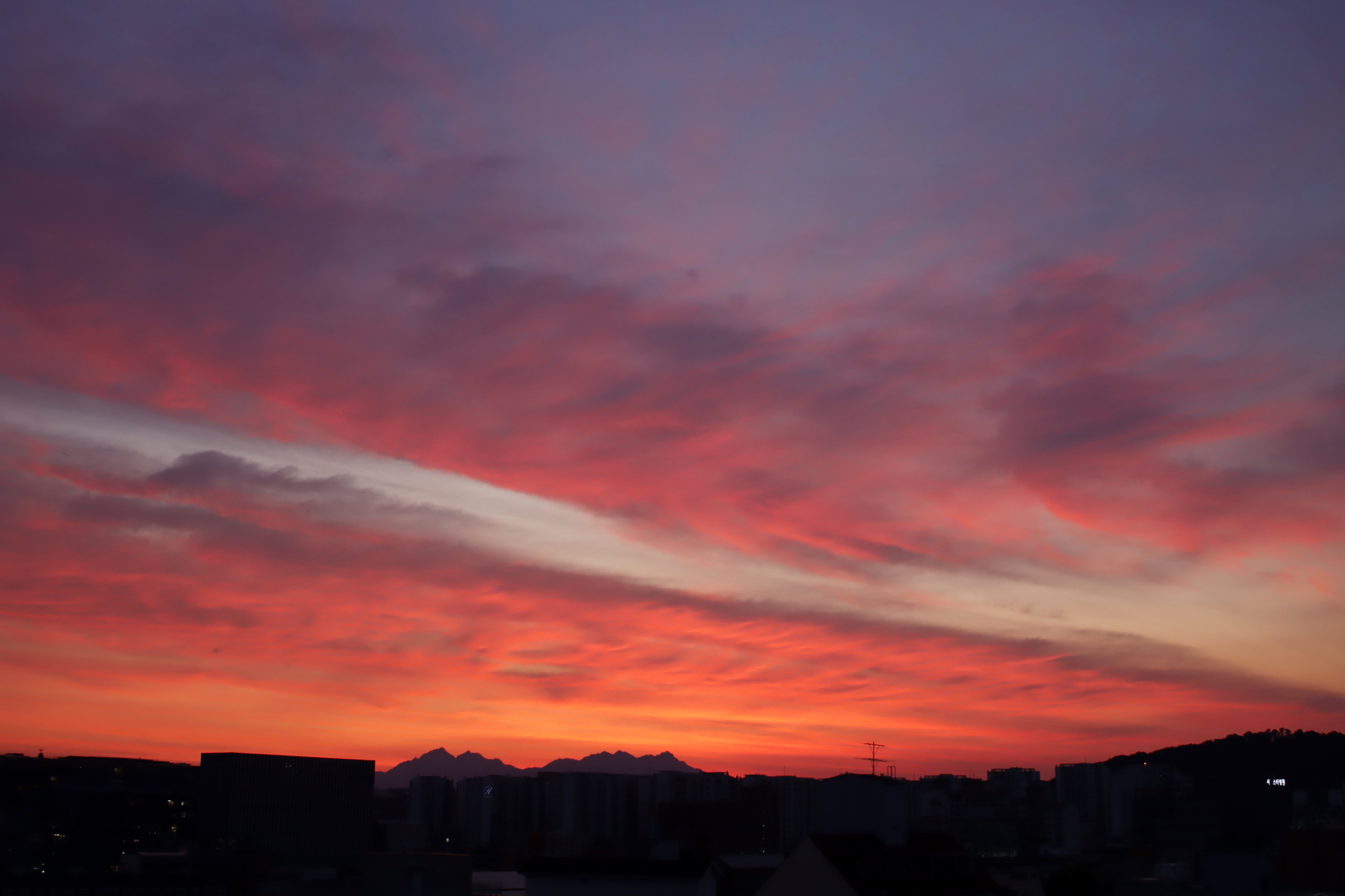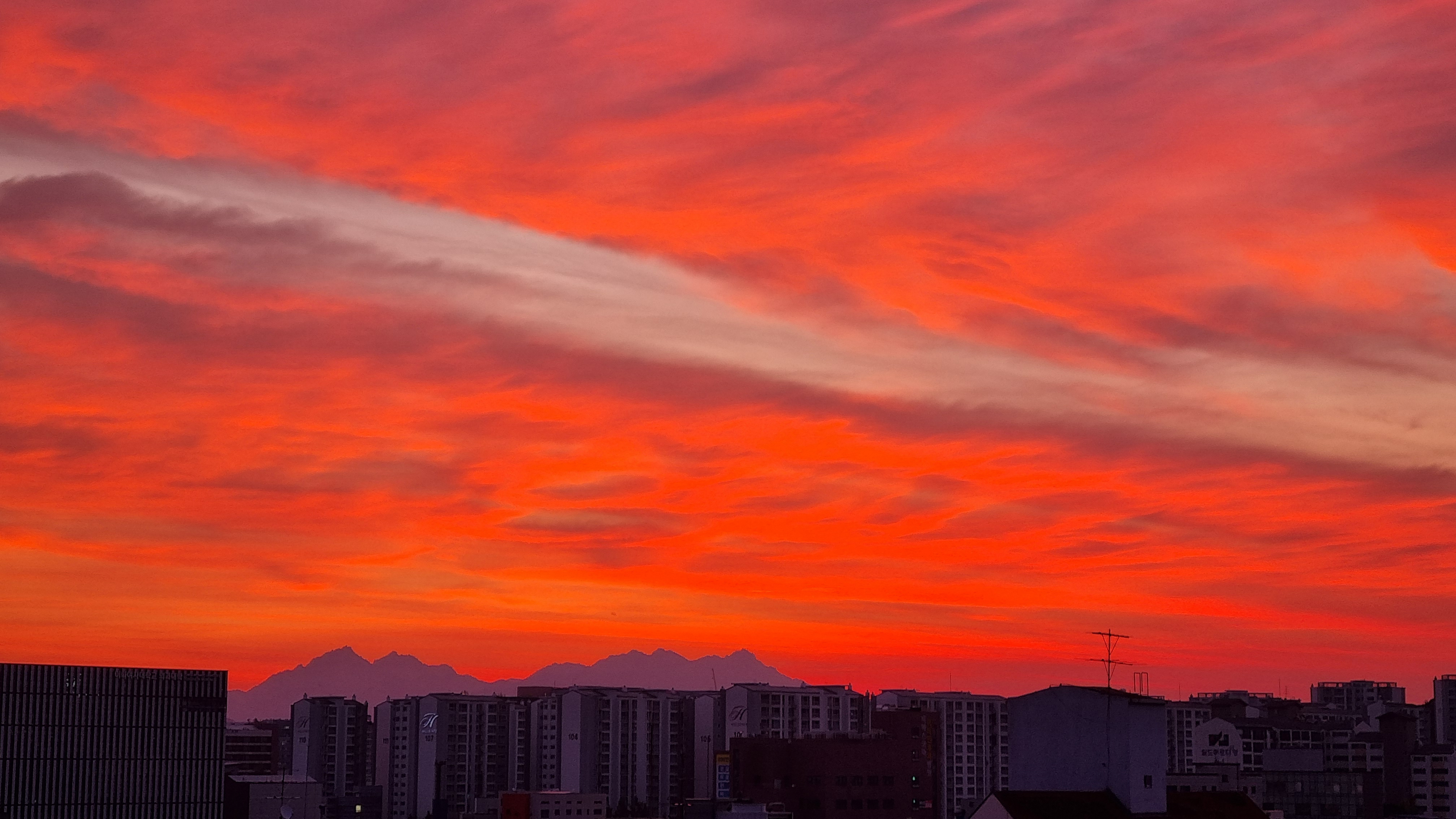 아침 4시 58분. 옥상. 하늘이 불타오른다.