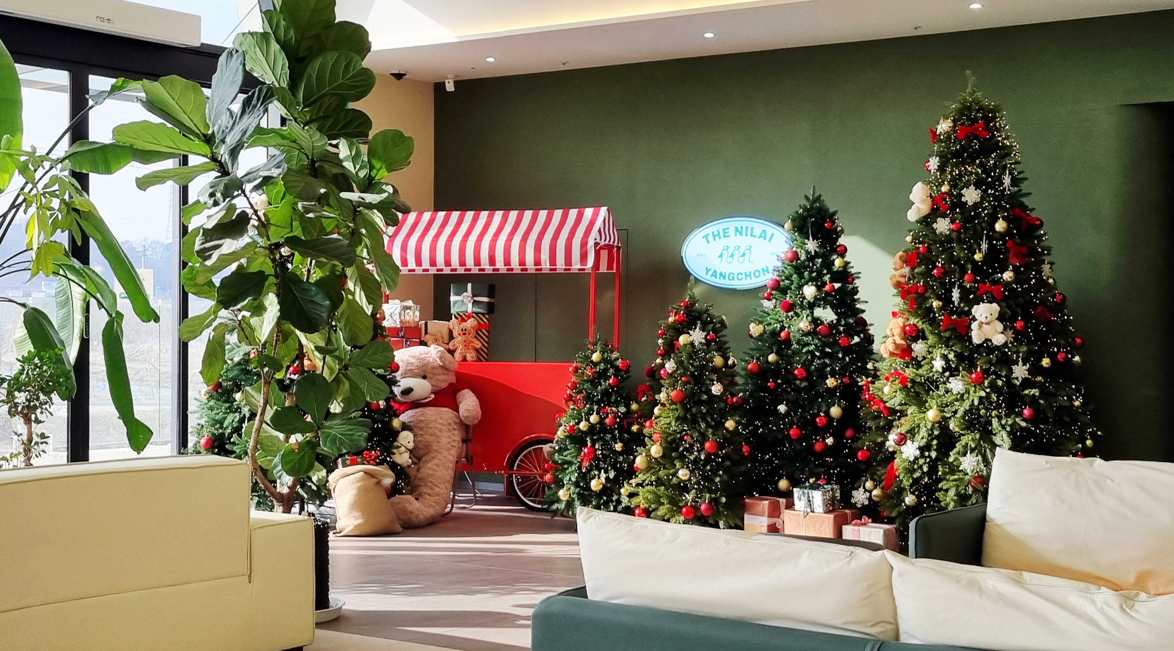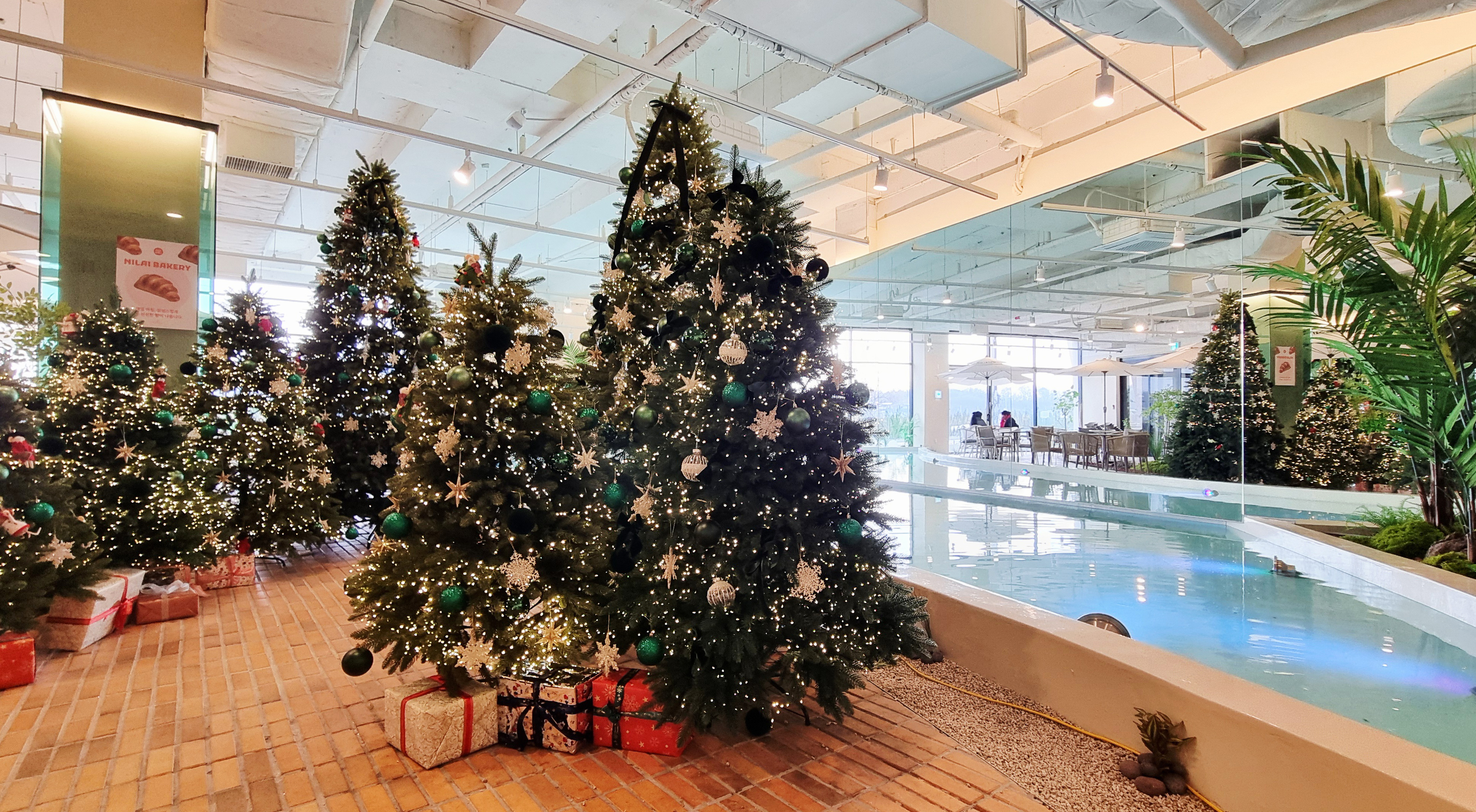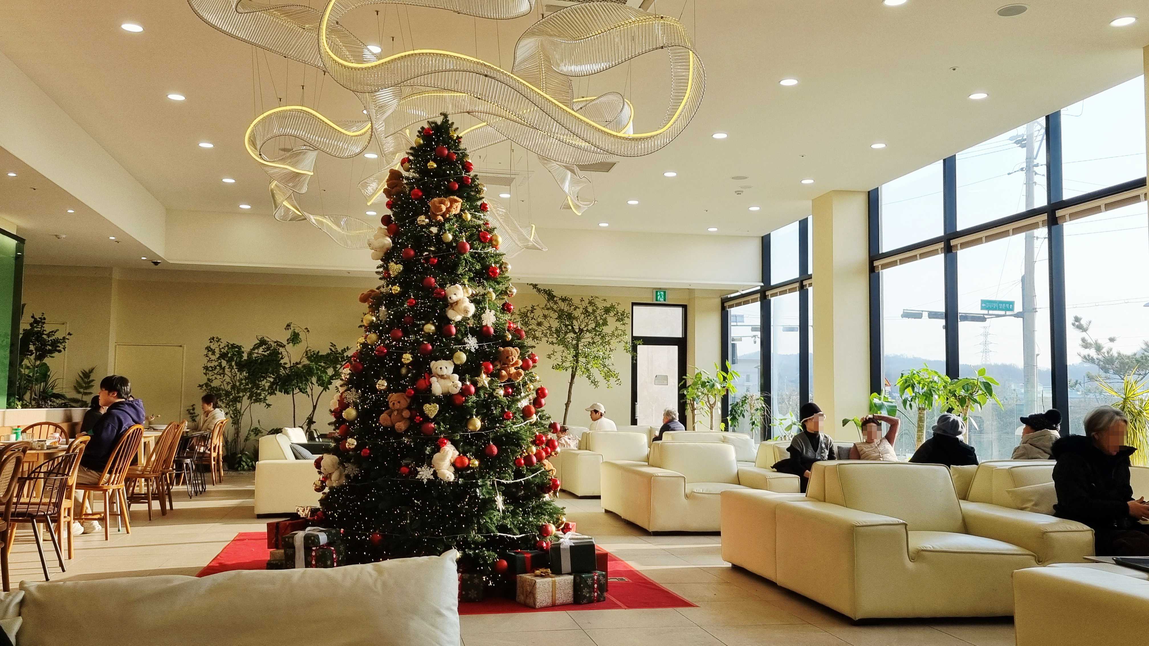 크리스마스 시즌이라 카페 곳곳에 대형 크리스마스트리가 장식되어 있어