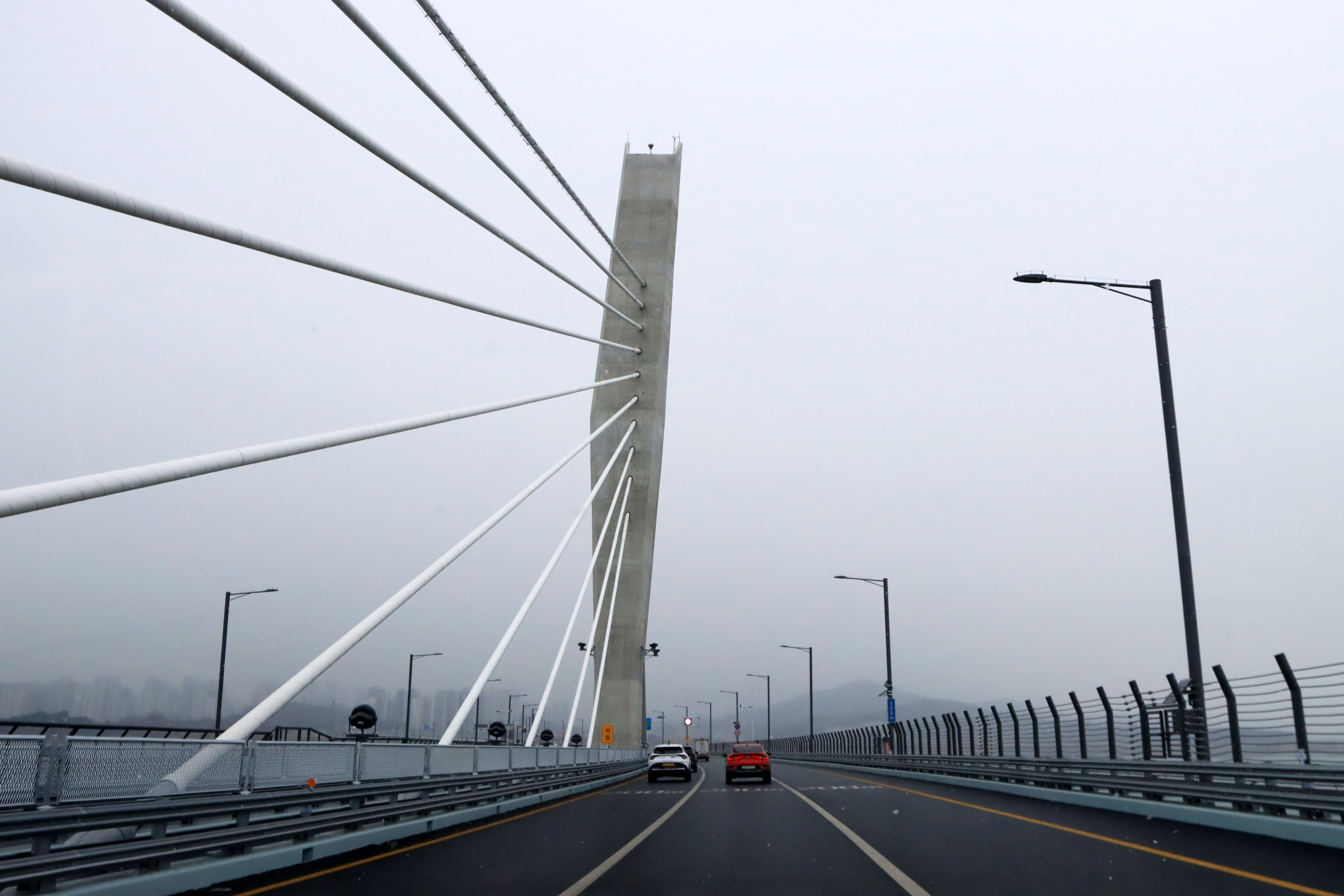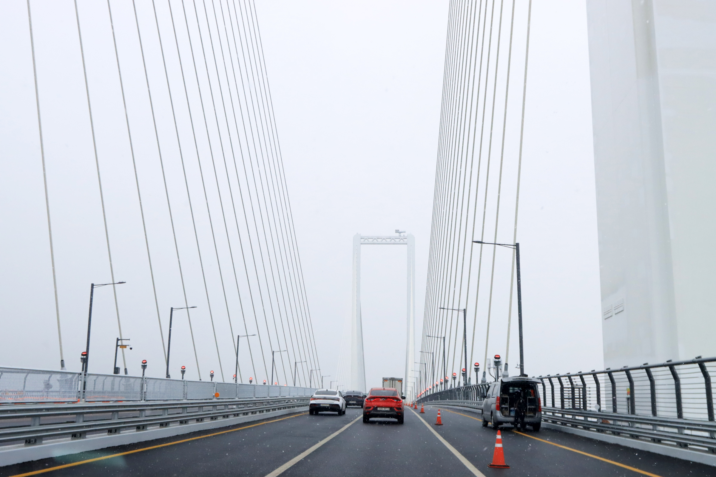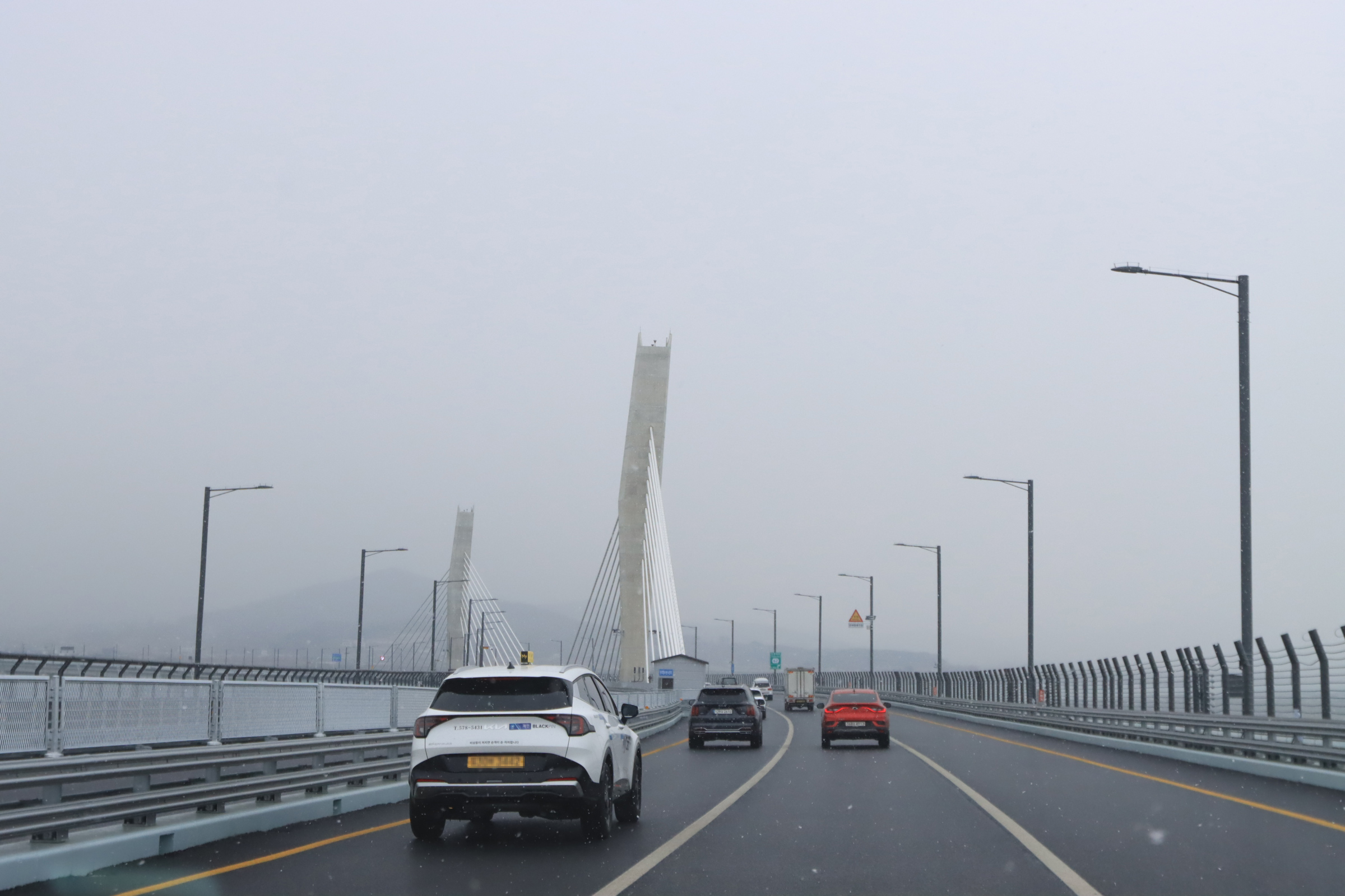 청라하늘대교를 건널 즈음 눈이 내리기 시작.