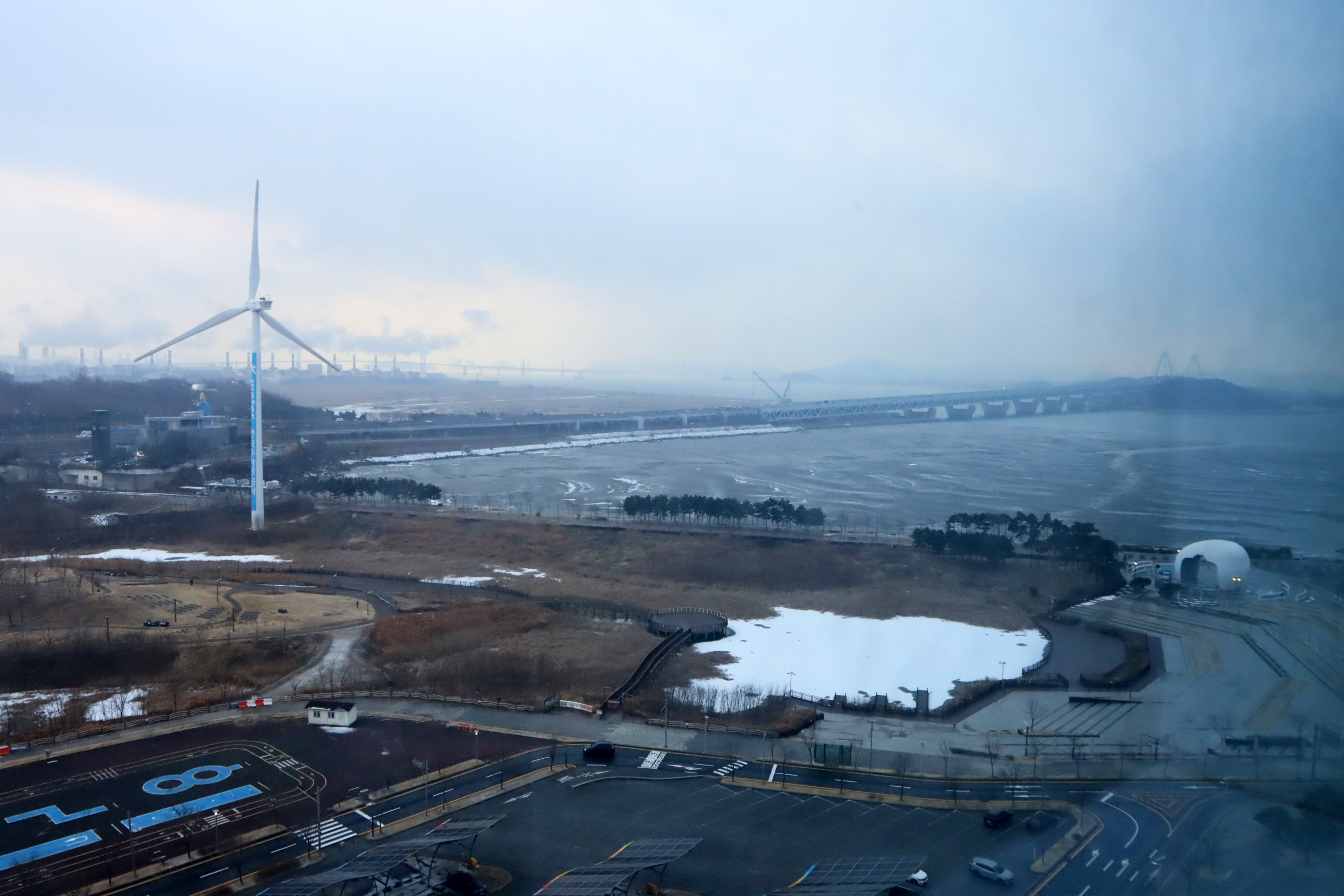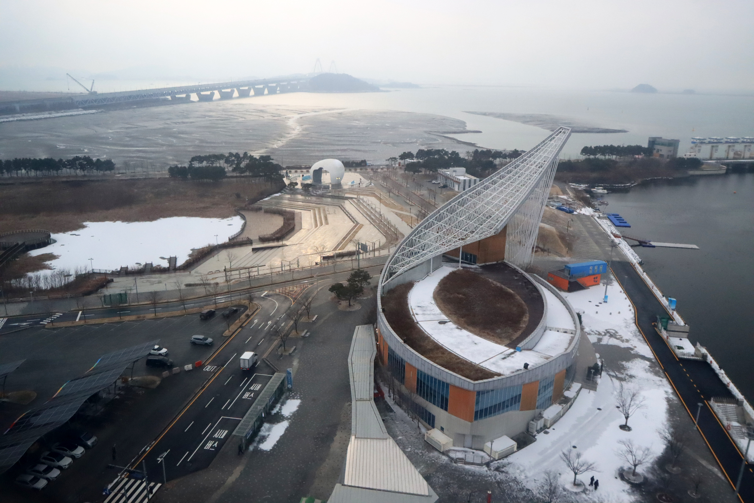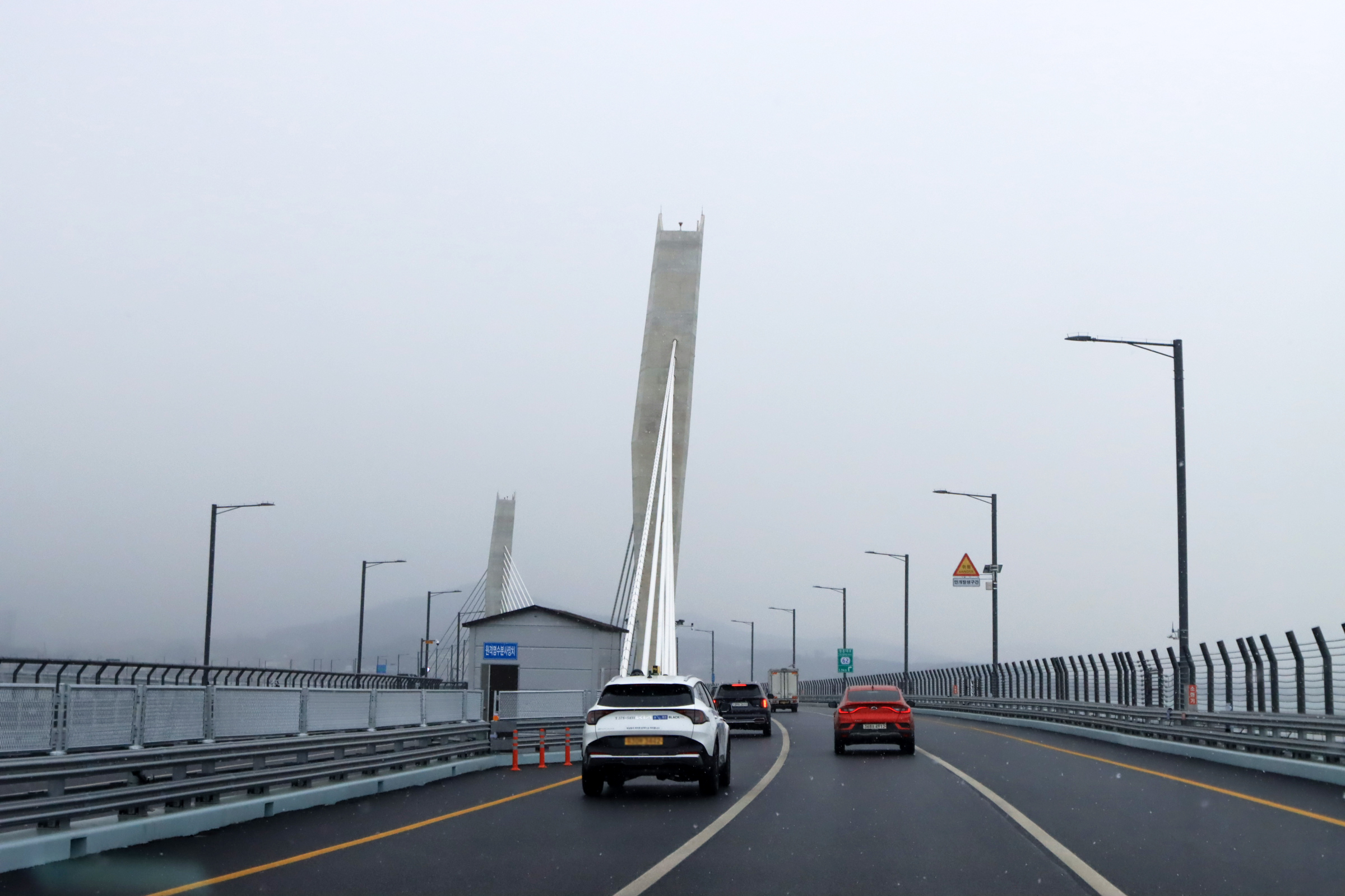 청라하늘대교를 건널 즈음 눈이 내리기 시작.